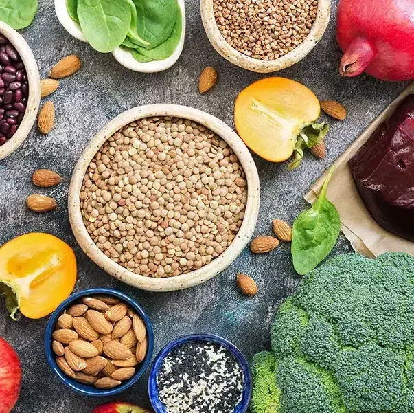 2. ברזל שמקורו מהצומח בלבד (Non-heme) – זמינותו הביולוגית נמוכה יותר. מזונות מהצומח שעשירים בברזל הם: קטניות, טחינה, סלק, קוואקר, אגוזים, ירקות עלים ירוקים, ברוקולי, אבוקדו, פירות יבשים ועוד. כדי שברזל מן הצומח יספג היטב, מומלץ לשלב מאכלים שעשירים בו עם מאכלים שעשירים בוויטמין C, כמו סלט ירקות או סלט פירות שמתובלים במיץ לימון.