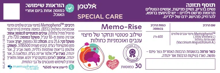 | מיצוי ענבים שלמים ואוכמניות כחולות (Memophenol™) | 600 מ"ג |