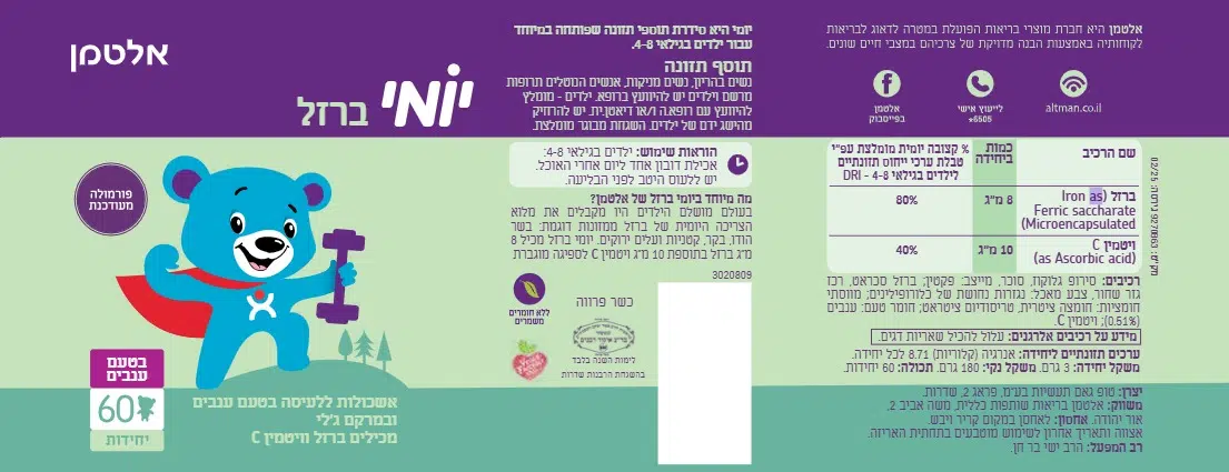 יומי ברזל מכיל 8 מ"ג ברזל בתוספת ויטמין C, ויטמין C לספיגה מוגברת. ללא חומרים משמרים.