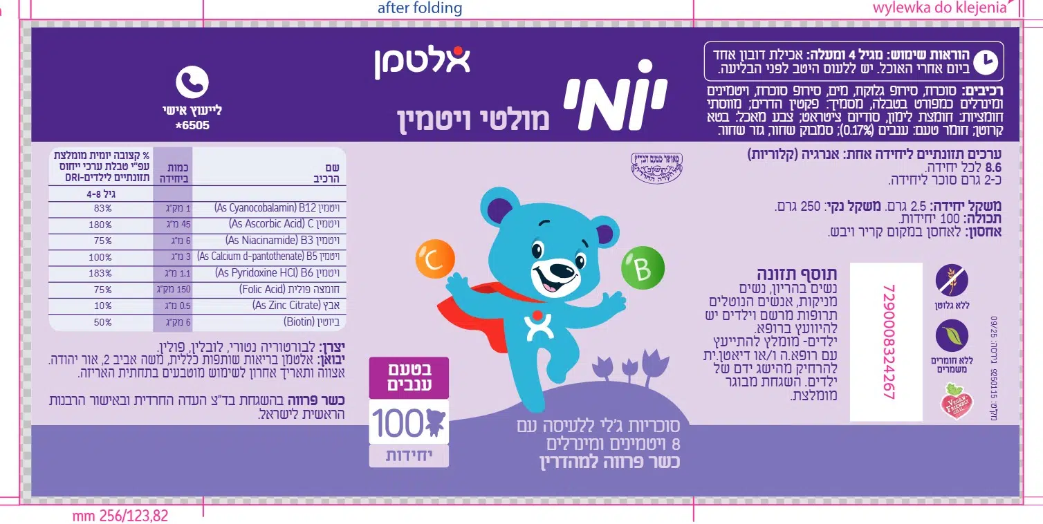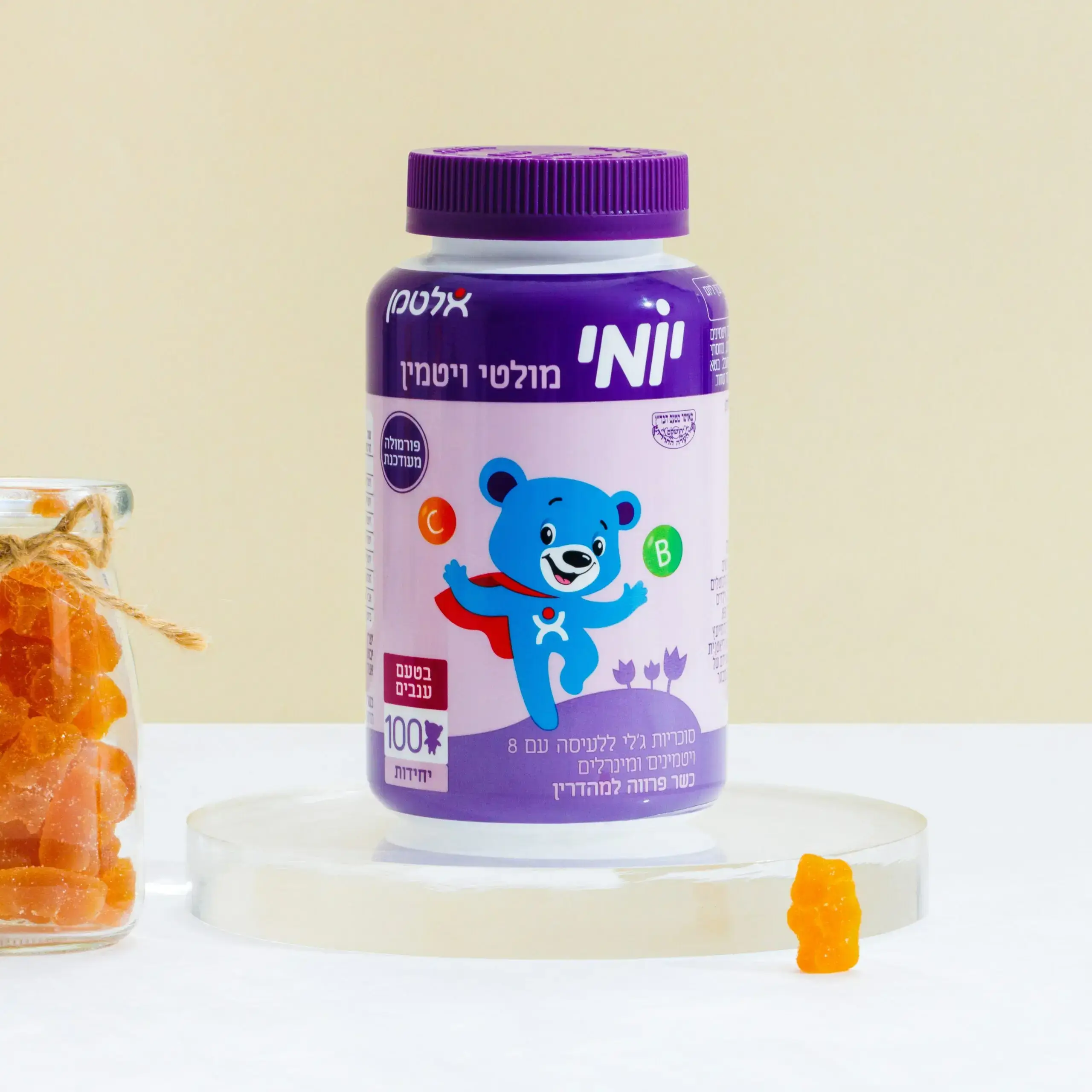 יומי היא סדרת תוספי תזונה שפותחה במיוחד עבור ילדים בגילאים שונים ולמצבי חיים יומיים שונים. סוכריות ג'לי עם 8 ויטמינים ומינרלים בטעם ענבים ללא חומרים משמרים וללא גלוטן טבעוני.