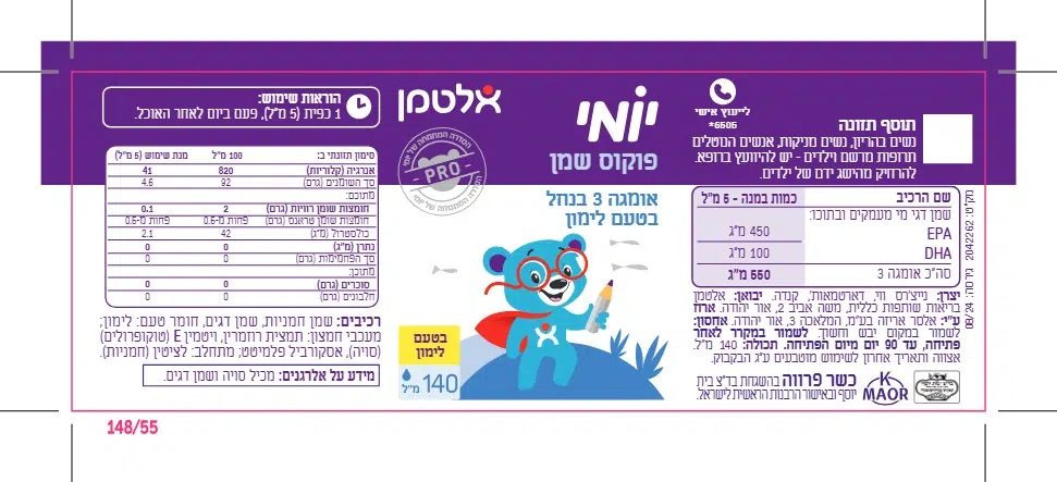 יומי היא סדרת תוספי תזונה שפותחה עבור ילדים בגילאים שונים ולמצבי חיים יומיים שונים יומי פוקוס שמן מכיל חומצות שומן אומגה 3 מדגים בריכוז EPA גבוה במיוחד טעם לימון.
