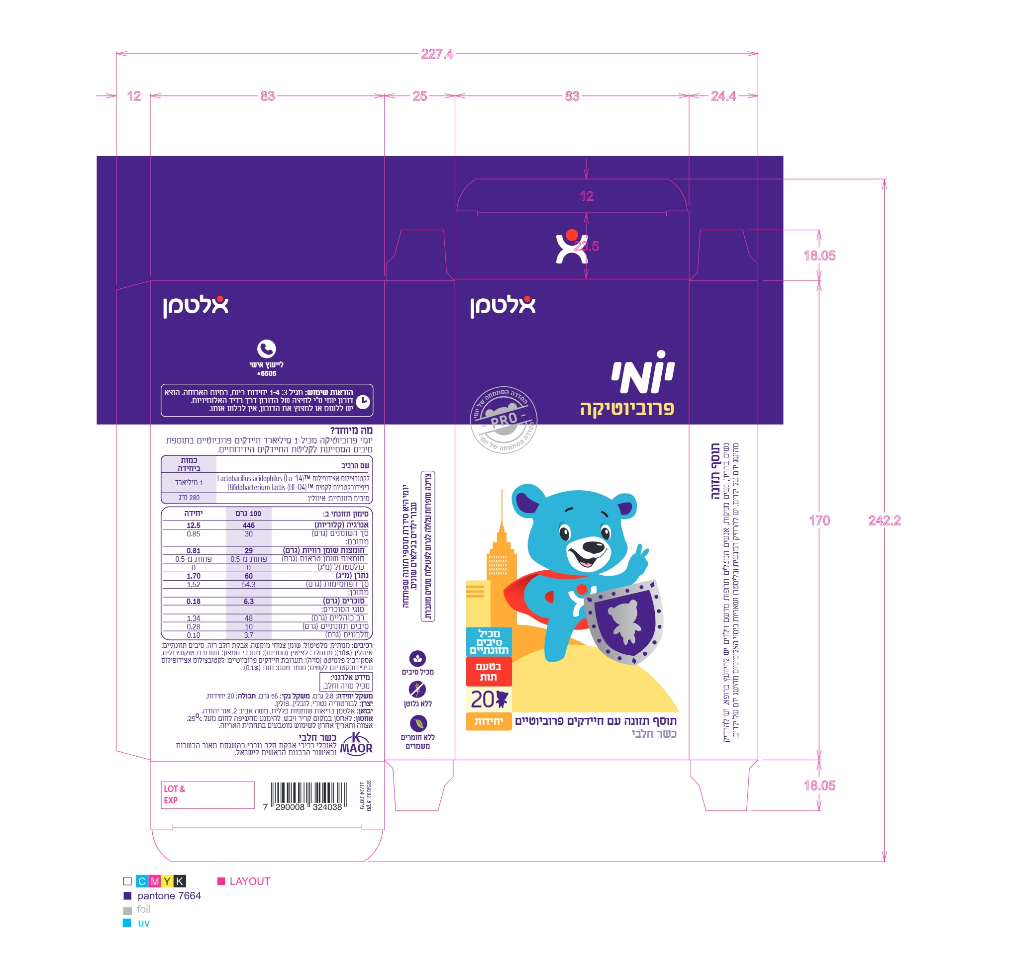 יומי פרוביוטיקה מכיל 1 מיליארד חיידקים פרוביוטיים בתוספת סיבים המסייעים לקליטת החיידקים ה"ידידותיים" ללא גלוטן וללא חומרים משמרים בטעם תות.