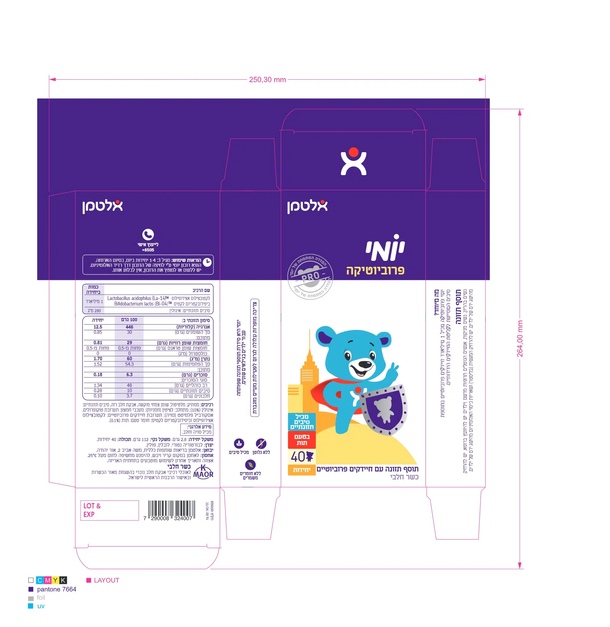 יומי פרוביוטיקה מכיל 1 מיליארד חיידקים פרוביוטיים בתוספת סיבים המסייעים לקליטת החיידקים ה"ידידותיים" ללא גלוטן וללא חומרים משמרים בטעם תות.
