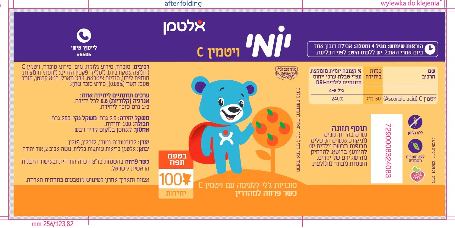 יומי היא סדרת תוספי תזונה שפותחה עבור ילדים בגילאים שונים ולמצבי חיים יומיים שונים. סוכריות ג'לי עם ויטמין C בטעם תפוזללא גלוטן וללא חומרים משמרים. טבעוני.