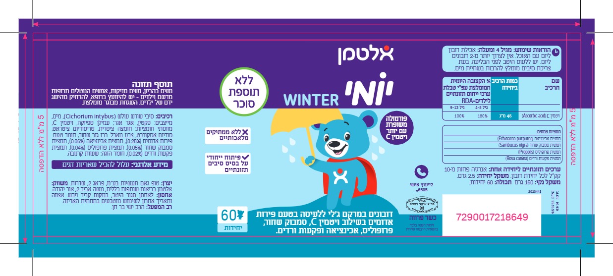 נשים בהריון, נשים מניקות, אנשים הנוטלים תרופות מרשם וילדים – יש להיוועץ ברופא. הרחק מהישג ידם של ילדים. מוצריה של אלטמן הם אינם תרופה ואינם מיועדים לרפא מחלה כלשהי. ההסתמכות על המידע המפורט להלן היא על אחריות הקורא בלבד ומומלץ להתייעץ עם רופא מוסמך טרם רכישת מוצר כלשהו. הנתונים המדויקים מופיעים על גבי המוצר, אין להסתמך על הפירוט המופיע באתר, יתכנו טעויות או אי התאמות, יש לקרוא את המופיע על גבי אריזת המוצר לפני השימוש. התמונות והתאריכים המופיעים הינם להמחשה בלבד ואין להסתמך עליהם.