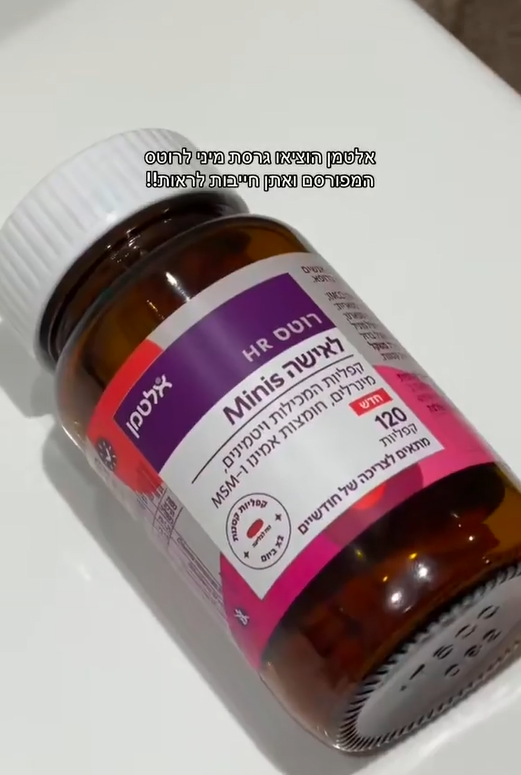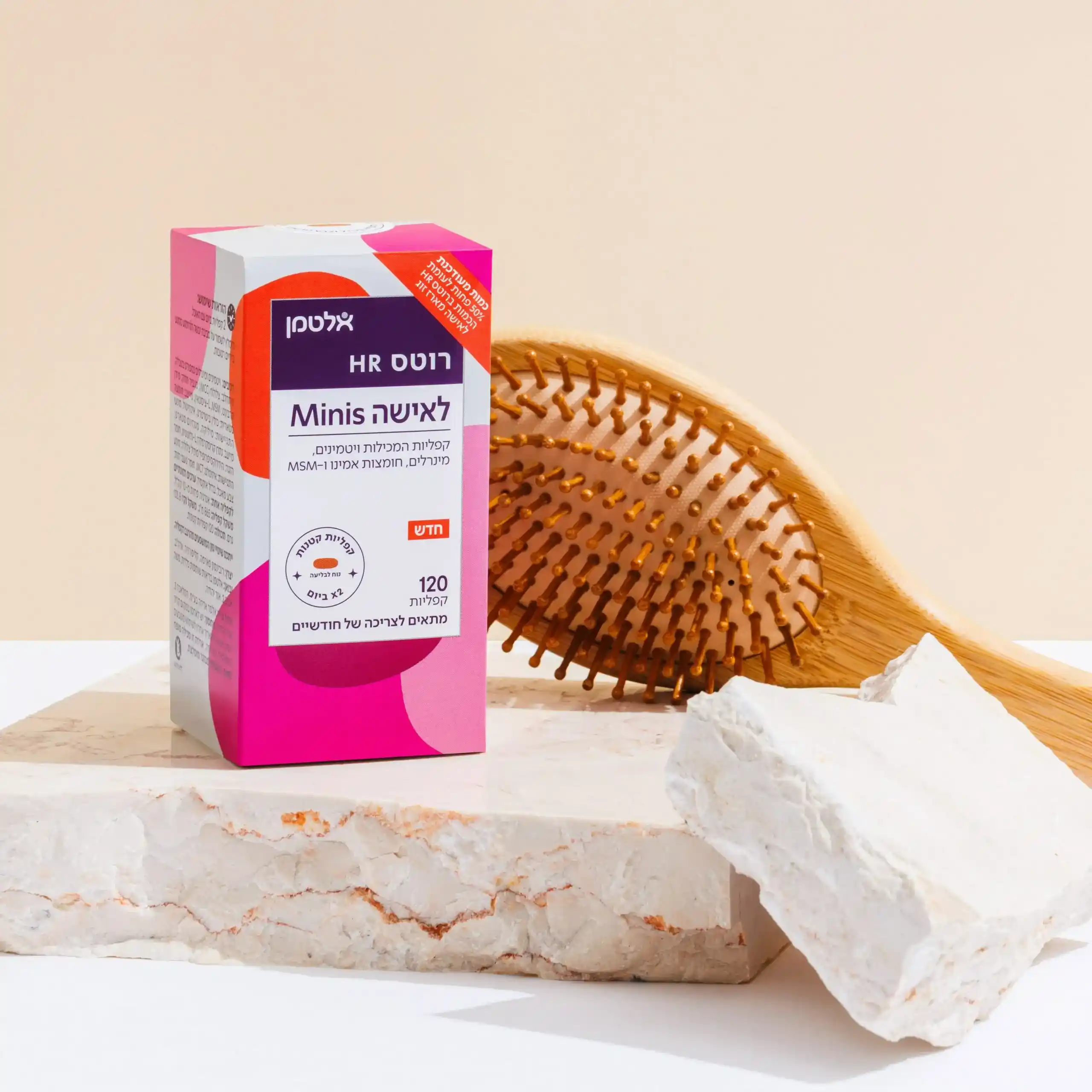 רוטס HR MINIS לאישה מכיל פורמולה ייעודית לנשים המכילה 18 רכיבי תזונה לבריאות וחיזוק שורש השערה, בקפליה מוקטנת ונוחה לבליעה, לקחת 2X ביום