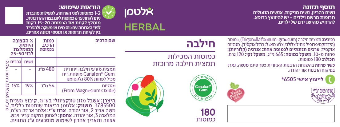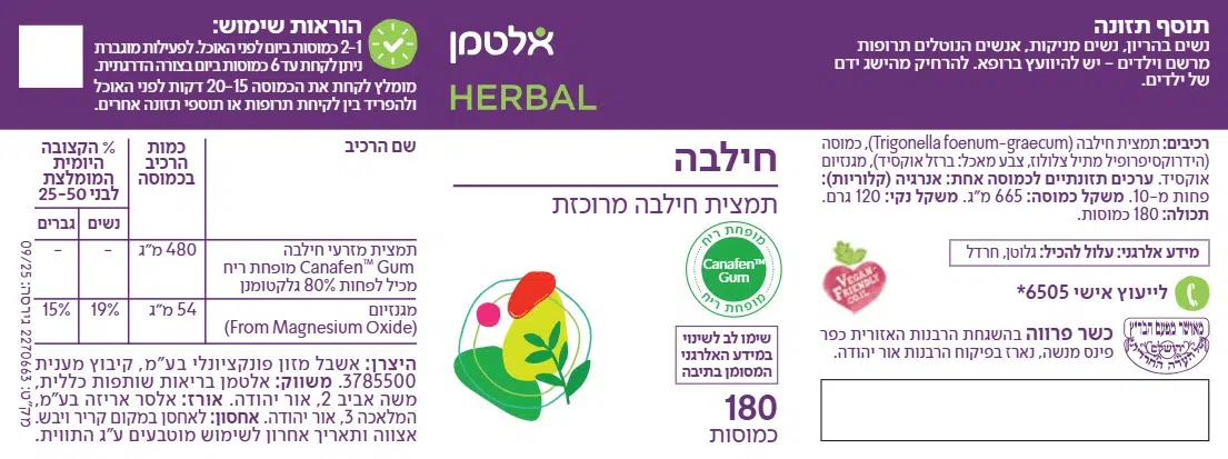 | תמצית מזרעי חילבה ייחודית Canafen® Gum מופחת ריח (מכיל לפחות 80% גלקטומנן) | 480 מ"ג |