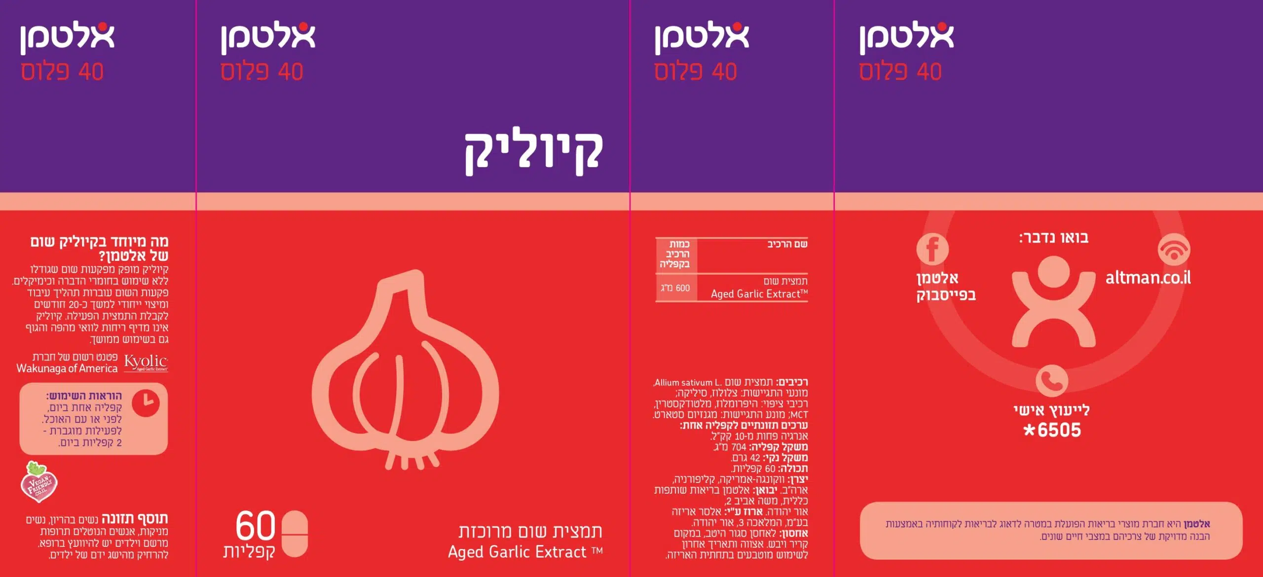תמצית שום מרוכזת Aged Garlic Extract(tm)קיוליק מופק מפקעות שום שגודלו ללא שימוש בחומרי הדברה וכימיקלים. פקעות השום עוברות תהליך עיבוד ומיצוי ייחודי למשך כ-20 חודשים לקבלת התמצית הפעילה קיוליק אינו מדיף ריחות לוואי מהפה והגוף גם בשימוש ממושך. טבעוני.