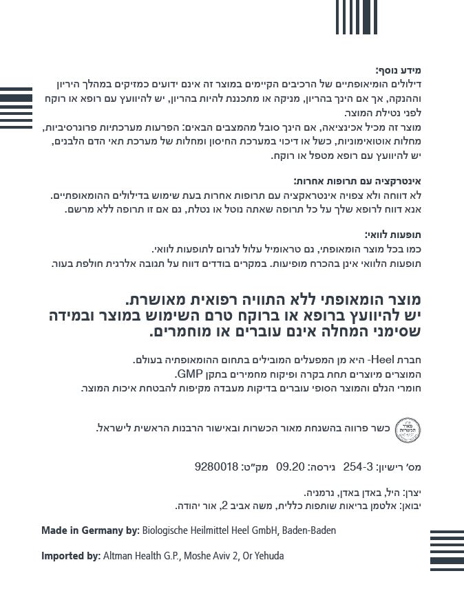 תכשיר הומאופתי ללא התוויה רפואית מאושרת. יש להיוועץ ברופא או רוקח טרם השימוש בתכשיר ובמידה שסימני המחלה לא עוברים או מוחמרים. מוצריה של אלטמן הם אינם תרופה ואינם מיועדים לרפא מחלה כלשהי. ההסתמכות על המידע המפורט להלן היא על אחריות הקורא בלבד ומומלץ להתייעץ עם רופא מוסמך טרם רכישת מוצר כלשהו. הנתונים המדויקים מופיעים על גבי המוצר, אין להסתמך על הפירוט המופיע באתר, יתכנו טעויות או אי התאמות, יש לקרוא את המופיע על גבי אריזת המוצר לפני השימוש. התמונות והתאריכים המופיעים הינם להמחשה בלבד ואין להסתמך עליהם.
