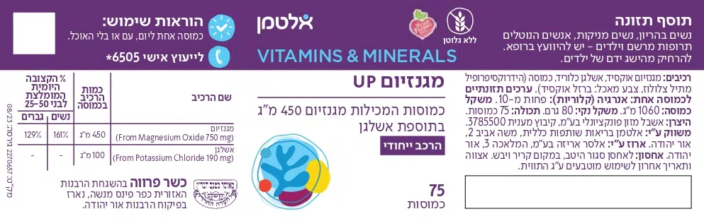 מינון גבוה של 450 מ"ג מגנזיום איכותי המופק ממעבדות בים המלח בתוספת אשלגן לפעילות משלימה.