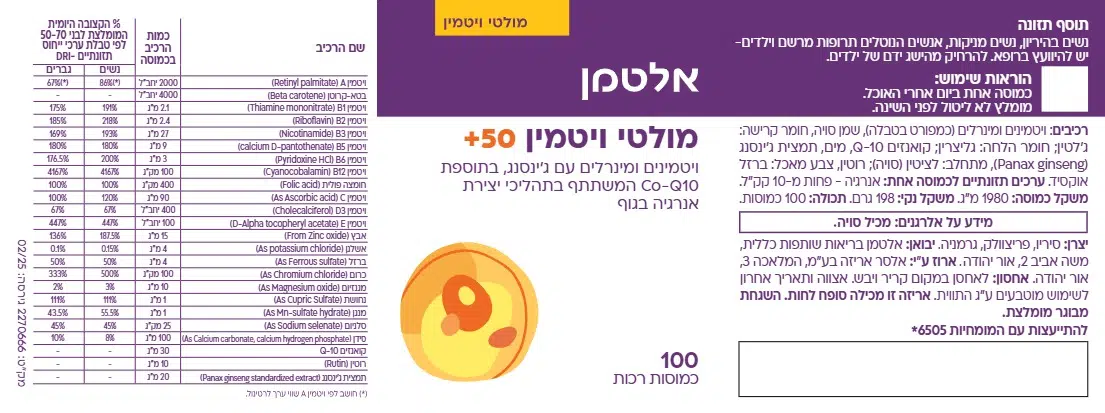 מולטי ויטמין ייעודי המותאם במיוחד לצרכים הגופניים הדרושים לנשים ולגברים בגילאי 50+ בתוספת קו אנזים Q-10 וג'ינסנג. להשלמה תזונתית המסייעת בשמירה על חיוניות, בריאות ואנרגיה!