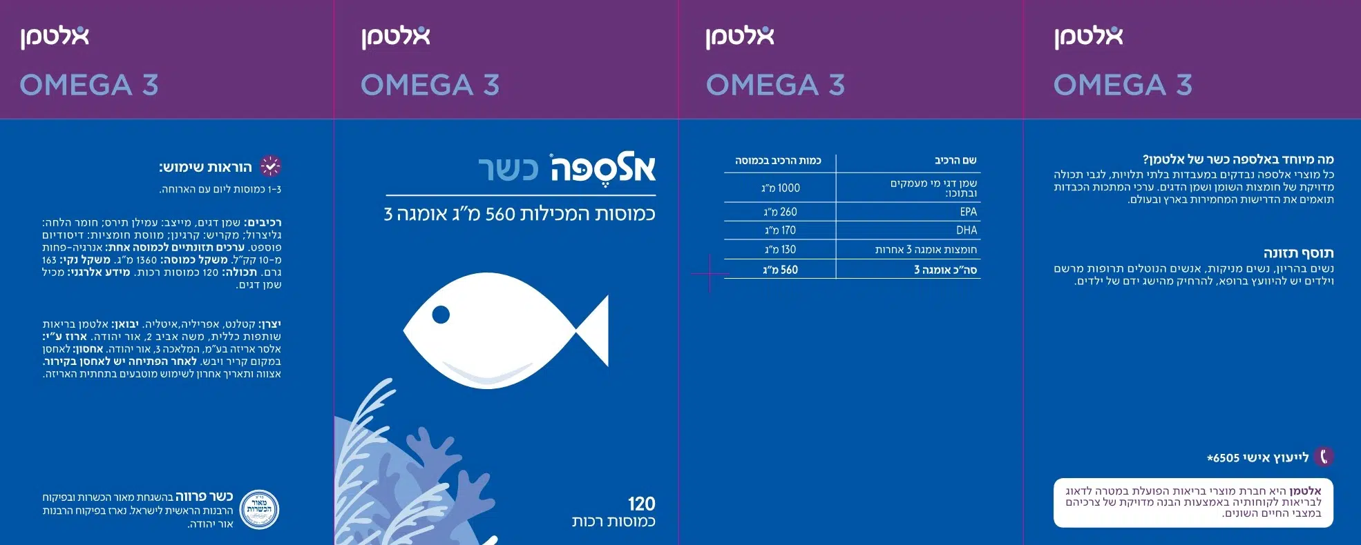 560 מ"ג אומגה 3 (כשר). אומגה 3 היא קבוצה של חומצות שומן חיוניות אשר גופינו לא יודע לייצר ולכן חייבים לקבל אותן מהתזונה שלנו. חומצות שומן אלה נחקרו במצבי בריאות שונים, יש להן תפקידים רבים במערכות הגוף השונות ובשלבי החיים השונים החל משלב העוברות ועד לזקנה.