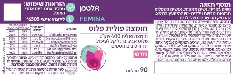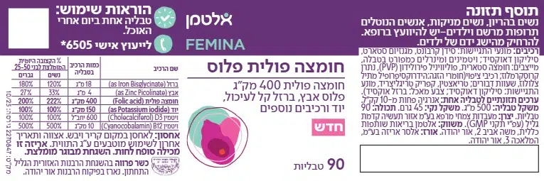 מכילה 400 מק"ג חומצה פולית פלוס אבץ, ברזל קל לעיכול, ויטמין D, יוד וויטמין 12B