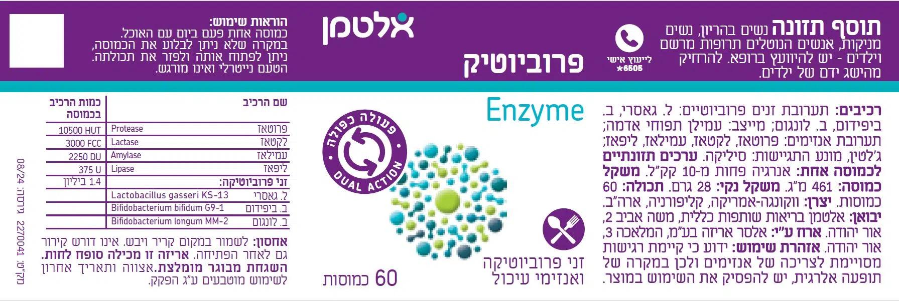 פרוביוטיקה בתוספת אנזימי עיכול לפירוק חלבונים (פרוטאז), לפירוק פחמימות (עמילאז), לפירוק שומנים (ליפאז) בתוספת לקטאז (לפירוק לקטוז). סינרגיה בין אנזימי העיכול לזני הפרוביוטיקה מאפשרת את שרידות החיידקים.