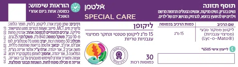 מיצוי פטנטי של ליקופן באיכות גבוהה (Lyc-O-Mato®) המופק מעגבניות טריות במינון גבוה של 15 מ"ג בכמוסה