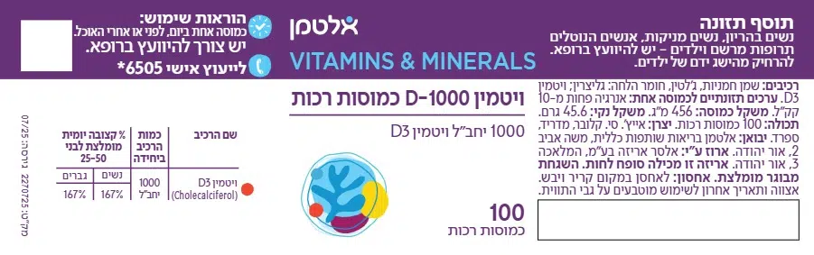 | ויטמין D3 (Cholecalciferol) | 1000 יחב"ל |