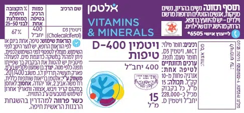 ויטמין D3 בצורתו הפעילה להשלמת חוסר כללי בויטמין D כל טיפה מכילה 400 יחב"ל ללא צבעי מאכל טעם תפוז.