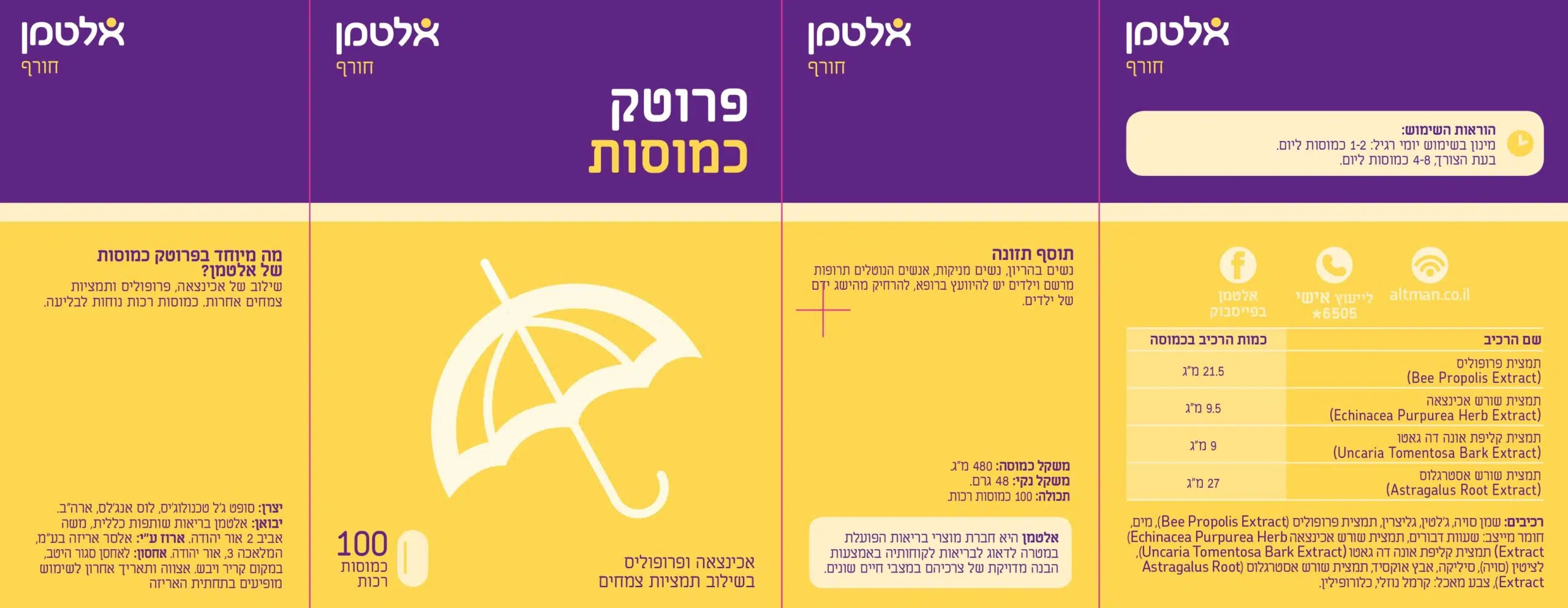 נשים בהריון, נשים מניקות, אנשים הנוטלים תרופות מרשם וילדים – יש להיוועץ ברופא. הרחק מהישג ידם של ילדים. מוצריה של אלטמן הם אינם תרופה ואינם מיועדים לרפא מחלה כלשהי. ההסתמכות על המידע המפורט להלן היא על אחריות הקורא בלבד ומומלץ להתייעץ עם רופא מוסמך טרם רכישת מוצר כלשהו. הנתונים המדויקים מופיעים על גבי המוצר, אין להסתמך על הפירוט המופיע באתר, יתכנו טעויות או אי התאמות, יש לקרוא את המופיע על גבי אריזת המוצר לפני השימוש. התמונות והתאריכים המופיעים הינם להמחשה בלבד ואין להסתמך עליהם.