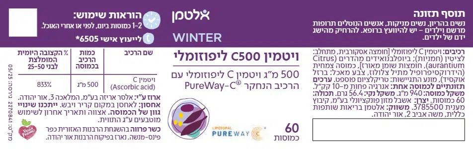 ויטמין C עם הרכיב הנחקר PureWay-C®, בטכנולוגיה ליפוזומלית – קומפלקס ייחודי של ויטמין C, חומצות שומן וביופלבנואידים המחזקים את יעילותו.