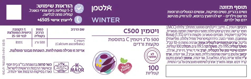 ויטמין C (לא חומצי) למערכת העיכול. קפליה מרוכזת המכילה 500 מ"ג ויטמין C בתוספת פקעות ורדים.