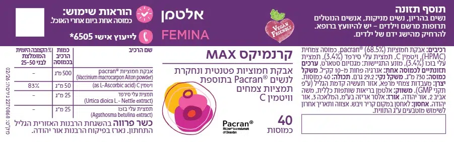 | תמצית חמוציות ((Cran Max®(Vaccinium macrocarpon) | 500 מ"ג |
